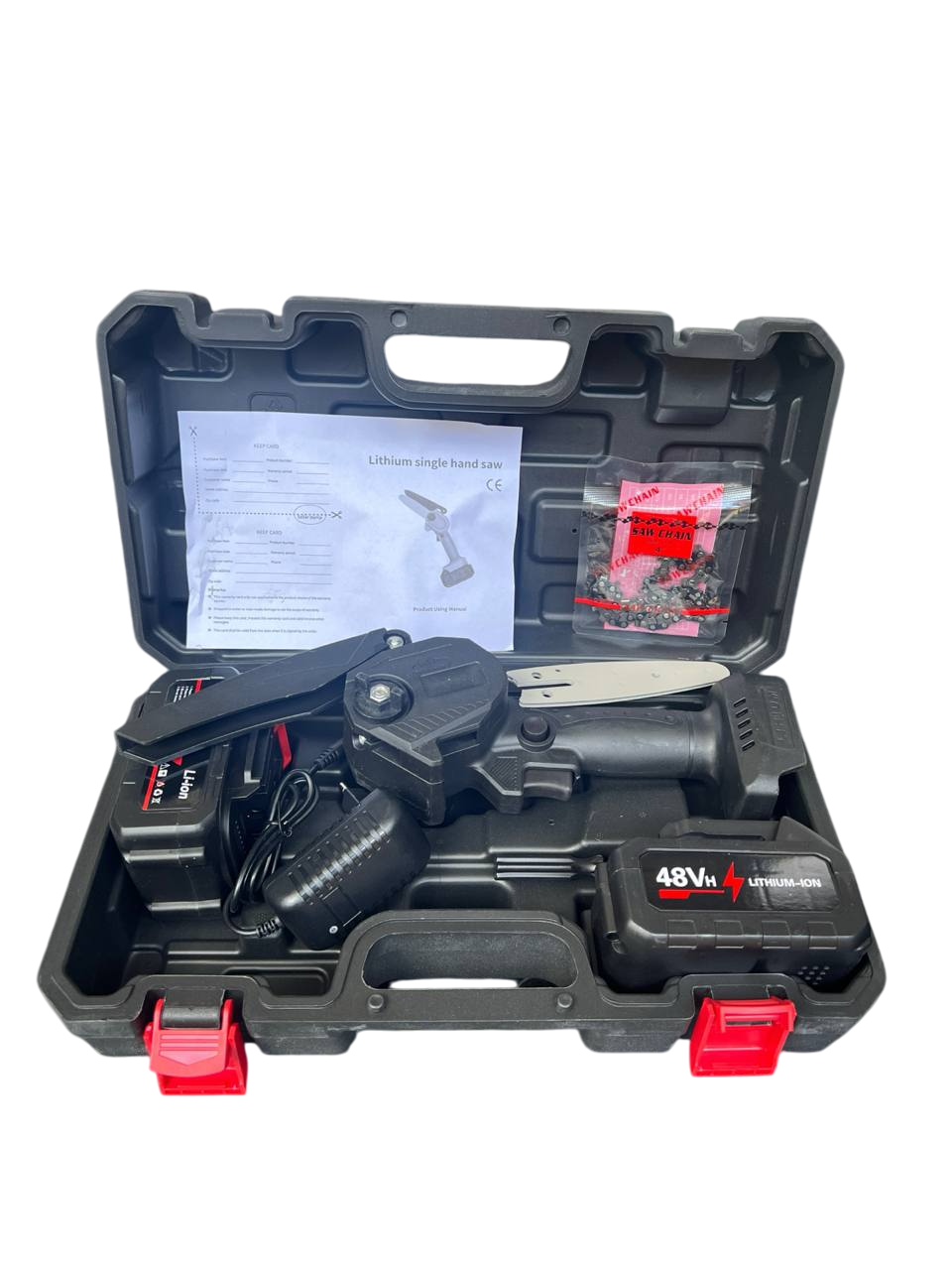 Мініобрізна пила з літієвою батареєю 2 шт. у комплекті (48 В) — це компактне та зручне електричне обладнання, призначене для роботи з деревиною та іншими матеріалами. Забезпечена потужним і надійним двигуном, ця ланцюгова пила здатна легко та швидко обрізати навіть най товстіші та найміцніші сучі.Благодаря літієвим батареям великої ємності, ця обрізна пила забезпечує тривалий час роботи без потреби підзаряджання. Крім того, комплект постачання містить дві батареї, що дає змогу вам без перерви продовжувати роботу навіть у тих випадках, коли одна з батарей розряджається.С 6-дюймовим пилковим цепом, ця електрична ланцюгова пилка забезпечує точні та чисті різі, що робить її незамінним інструментом для садівників, ландшафтних дизайнерів і будівельників. Зручна ручка та компактний дизайн роблять цю обрізну пилку легкою в керуванні та зручною у використанні.